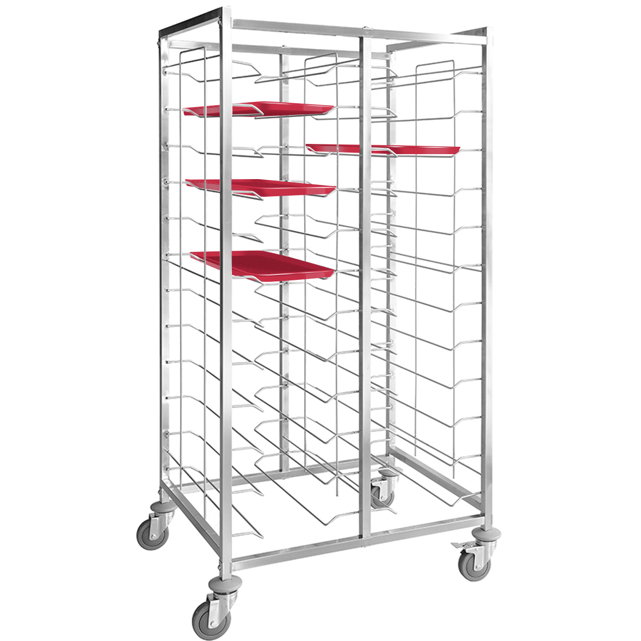 Tämä korkealaatuinen ammattimainen hyllykärry on ihanteellinen suurien määrien kaupallisten gastronorm-vuokien tai -pannujen pinoamiseen ja säilyttämiseen. Sen 12 tasoa on asennettu neljälle pyörälle, mikä helpottaa liikkumista ravintolassasi, leipomossasi tai vastaavassa catering-laitoksessa. Kapasiteetti: 24 tasoa, joille mahtuu tarjottimia ja astioita, joiden leveys on 200 mm – 460 mm. Mitat: 970x650x1720 mm. Kts. ’Tekniset tiedot’ -kohdasta yksityiskohtaisia tietoja.