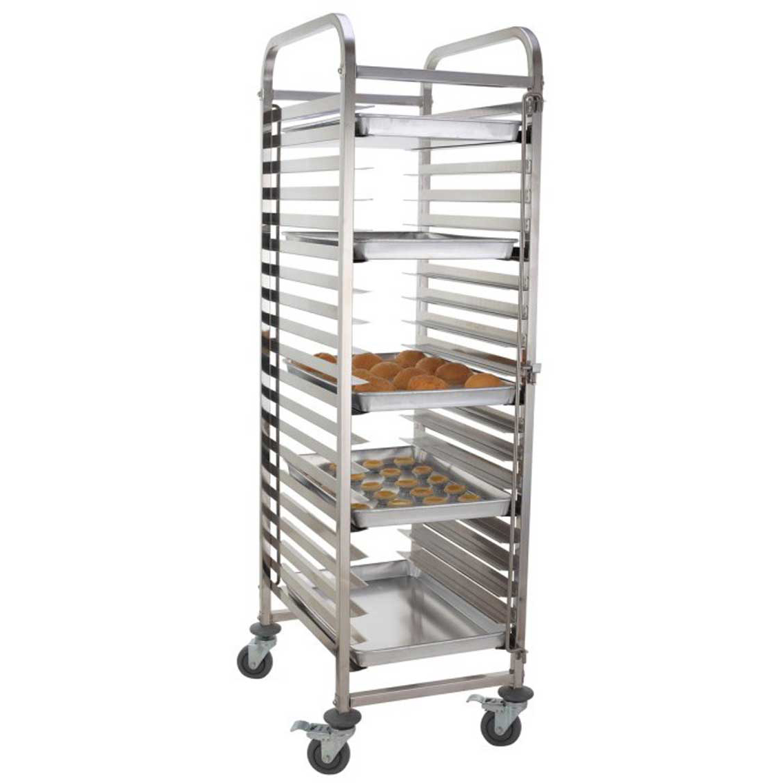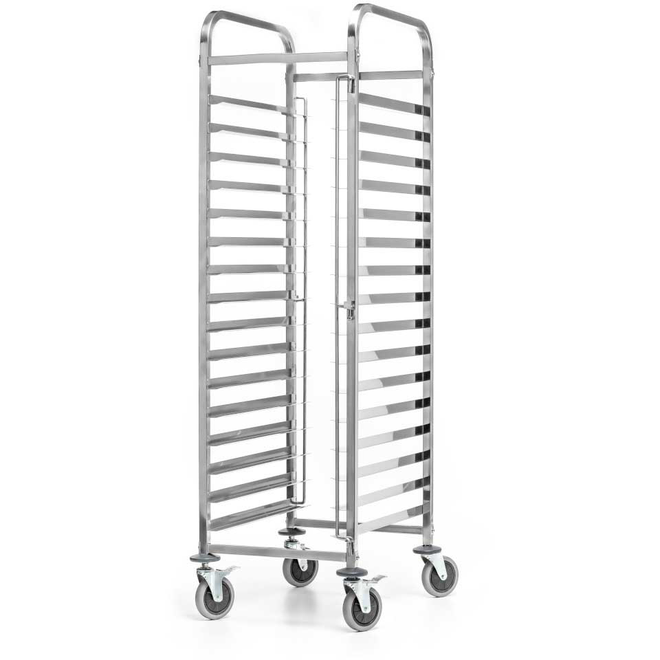 Tämä korkealaatuinen 400x600mm leipomokokoa oleva ammattilaiskäyttöön tarkoitettu kärry on ihanteellinen suurten määrien kaupallisten ravintolatarjottimien, pannujen tai tarjottimien pinontaan ja säilytykseen. Se on varustettu neljällä pyörällä liikkumisen helpottamiseksi. Katso tarkemmat tiedot ’Määrittely’ -kohdasta.
