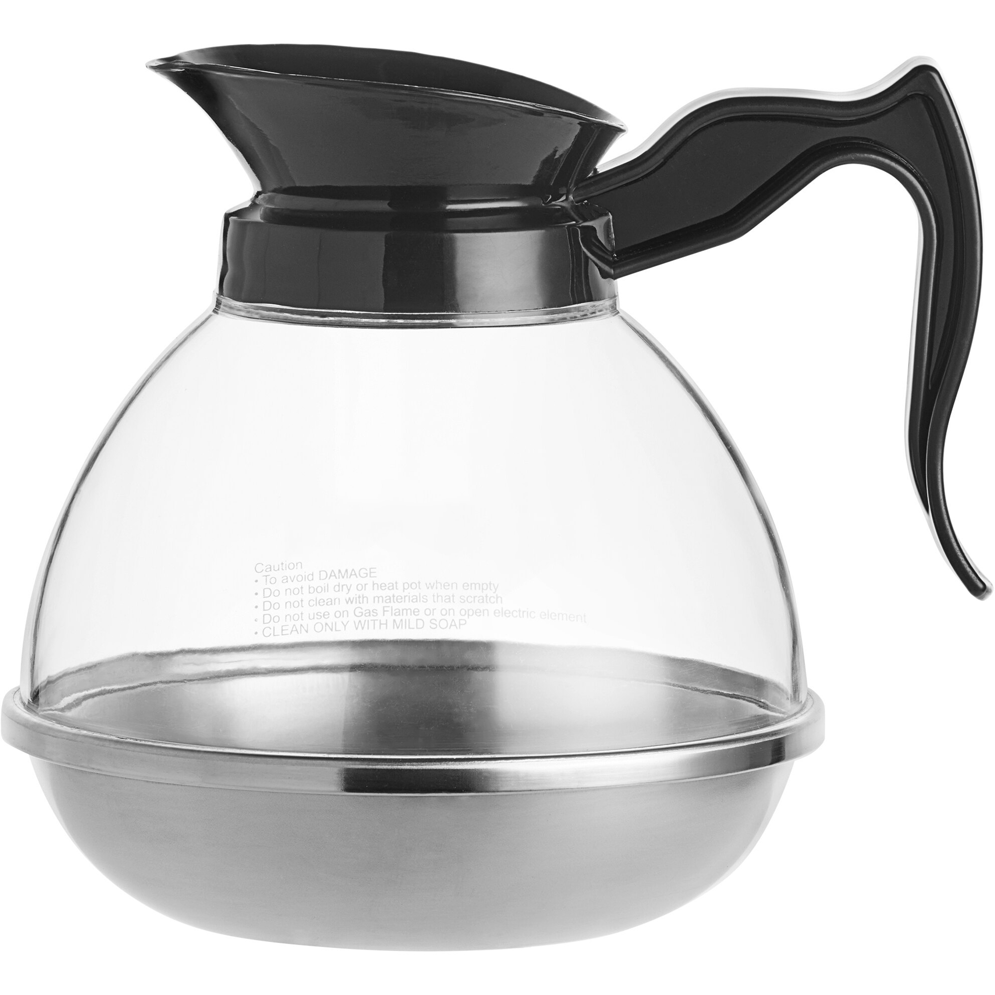 Sen tyylikäs ruostumattomasta teräksestä valmistettu pohja erottaa sen muista samanlaisista karahveista. Tämä kannu kestää kovaa käyttöä ja on täydellinen lisä mihin tahansa kahvilaan, ravintolaan, ruokalaan, kioskille tai juhlapalvelutapahtumaan! Tämä pohja tarjoaa paremman kestävyyden ja lujuuden verrattuna vastaaviin lasipohjiin, ja se auttaa peittämään mahdollisia rumia kahvitahroja. Katso tarkemmat tiedot kohdasta ’Määritykset’.