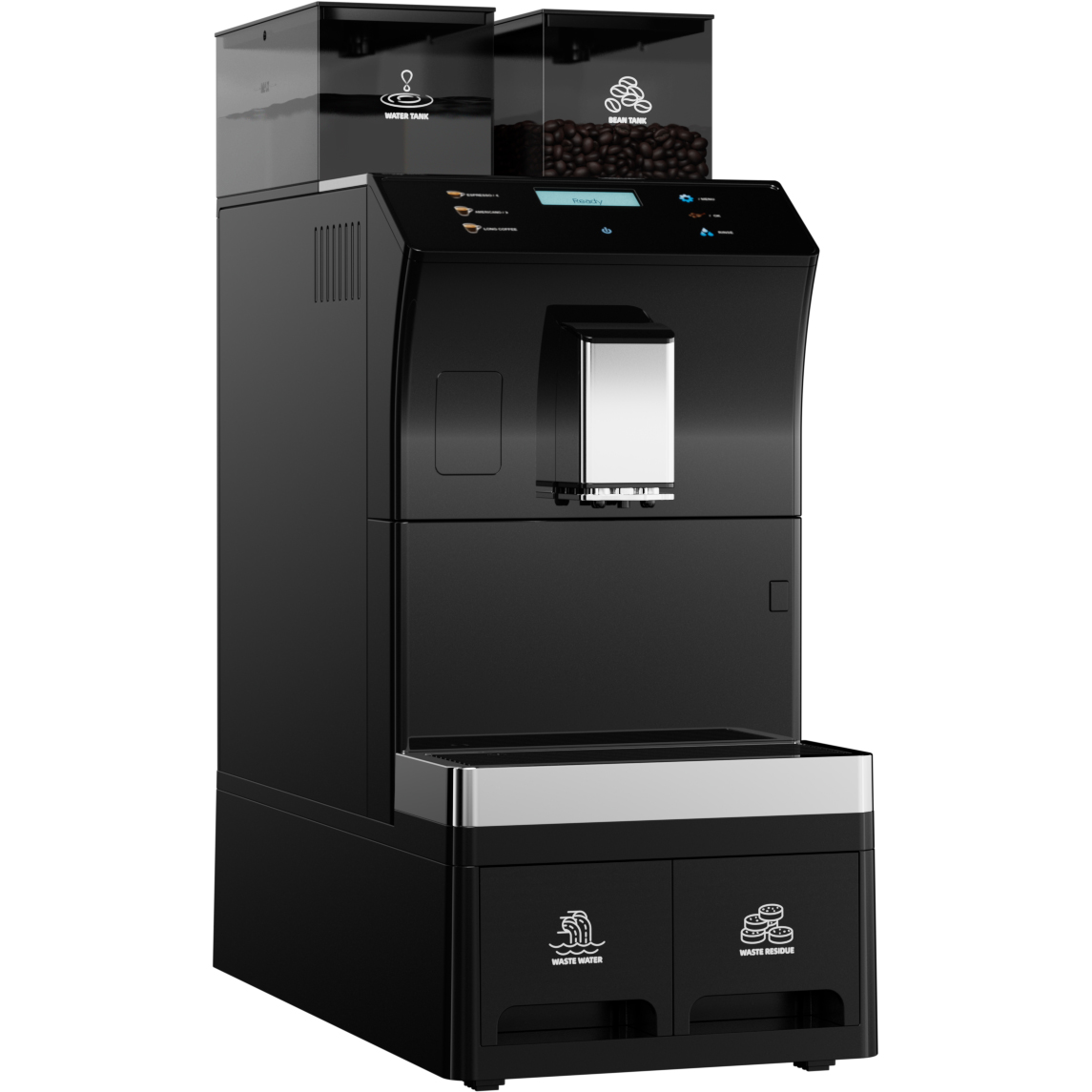 Nosta kahvitarjoilusi tasoa tällä ammattimaisella automaattisella kahvikoneella. Tarjoa barista-laatuista kahvia vertaansa vailla olevalla nopeudella ja johdonmukaisuudella, kaikki napin painalluksella. Tämä täysin automaattinen kahvikone on täydellinen ratkaisu suurille volyymeille toimistossasi, lounashuoneessasi, kahvilassasi, hotellissasi tai pikapalveluympäristössäsi, poistaen laajan baristakoulutuksen tarpeen ja taaten poikkeuksellisen maun jokaisessa kupissa. Keskeiset ominaisuudet ja edut: Aito ”Papu-kupissa” Tuoreus: Integroitu, ammattitason ruostumattomasta teräksestä valmistettu kartiomainen jauhinkone jauhaa kokonaiset pavut tilauksesta jokaista juomaa varten, säilyttäen maksimaalisen aromin ja maun, joka menetetään esijauhetussa kahvissa. Suuri volyymi ja nopeus: Suunniteltu jatkuvaan käyttöön, tämä tehopakkaus voi tuottaa jopa 80 täydellistä juomaa tunnissa, mikä vähentää odotusaikoja merkittävästi ruuhka-aikoina. Yhden kosketuksen erikoisvalikko: Tarjoa laaja valikoima suosittuja juomia yhdellä napautuksella, mukaan lukien Espresso, Cappuccino, Latte Macchiato, Americano, Flat White ja Kuuma Vesi/Höyry. 3 vesiliitäntämahdollisuutta: Yhdistetään suoraan vesijohtoon jatkuvaa käyttöä varten ilman jatkuvaa täyttötarvetta, yhdistä se ulkoiseen vesilähteeseen tai käytä suurta sisäistä vesisäiliötä. Yksinkertaistettu puhdistus ja ylläpito: Sisältää automaattiset huuhtelu- ja puhdistusohjelmat keittoyksikölle ja maitokoneistolle, minimoiden työvoiman ja varmistaen optimaalisen hygienian ja koneen pitkäikäisyyden. Vankka kaupallinen rakenne: Rakennettu kestämään vilkkaan kaupallisen ympäristön vaatimukset. Intuitiivinen käyttöliittymä: Käyttäjäystävällinen värillinen LCD-kosketusnäyttö yksinkertaistaa juomien valintaa sekä henkilökunnalle että itsepalveluasiakkaille. Mukautettavat juomareseptit, vahvuus ja tilavuus ovat täysin ohjelmoitavissa. Automaattinen kahvipapujäämän poistojärjestelmä 100% ruostumattomasta teräksestä valmistettu kartiomainen jauhinkone Irrotettava keittoyksikkö Säädettävä kahvin vahvuus Säädettävä kahvin tilavuus Säädettävä kahvin lämpötila Säädettävä kahvijauheen jauhatuskoko Automaattinen huuhtelu helppoa puhdistusta varten Nopea keittoytimen puhdistus Katso tarkemmat tiedot kohdasta ’Tekniset tiedot’.