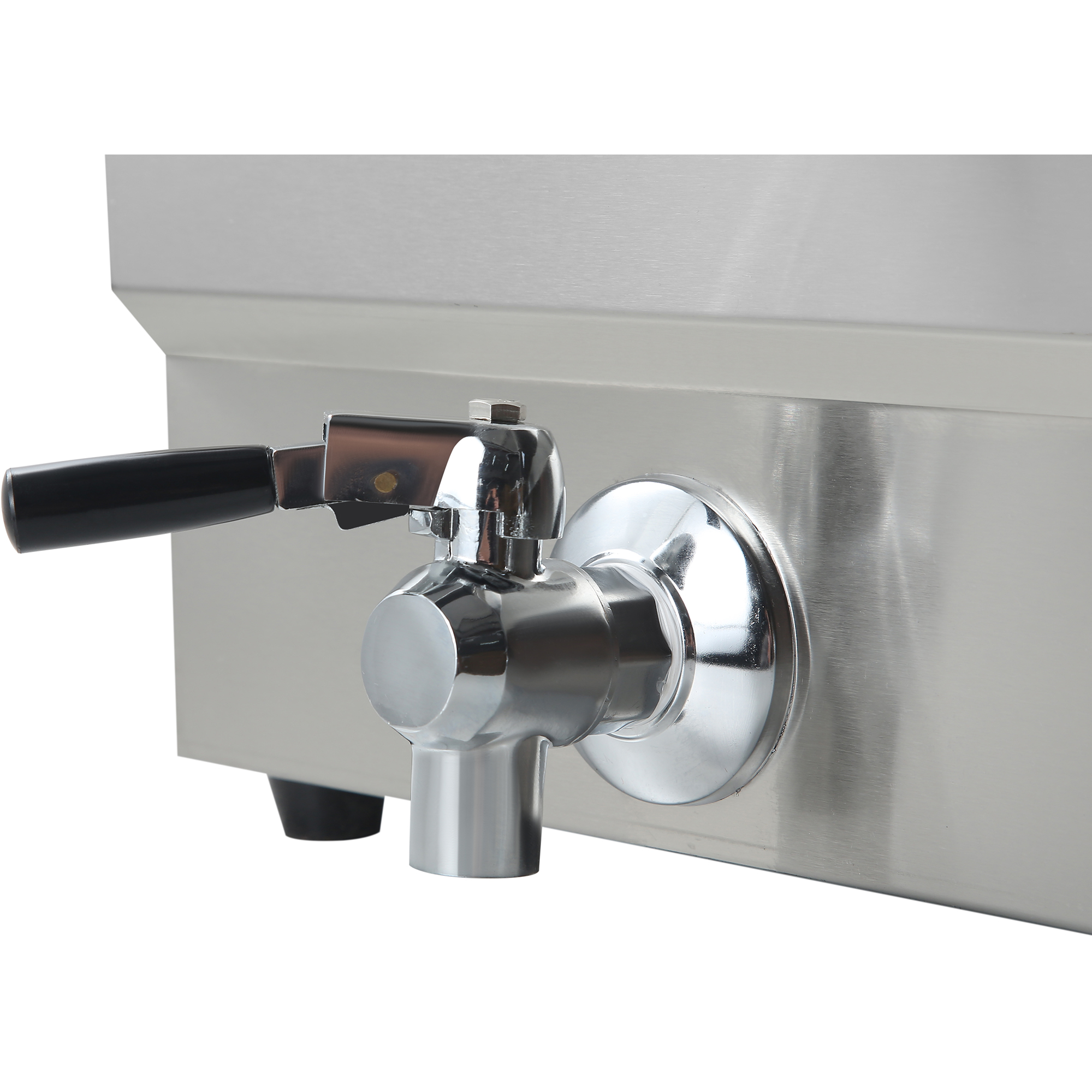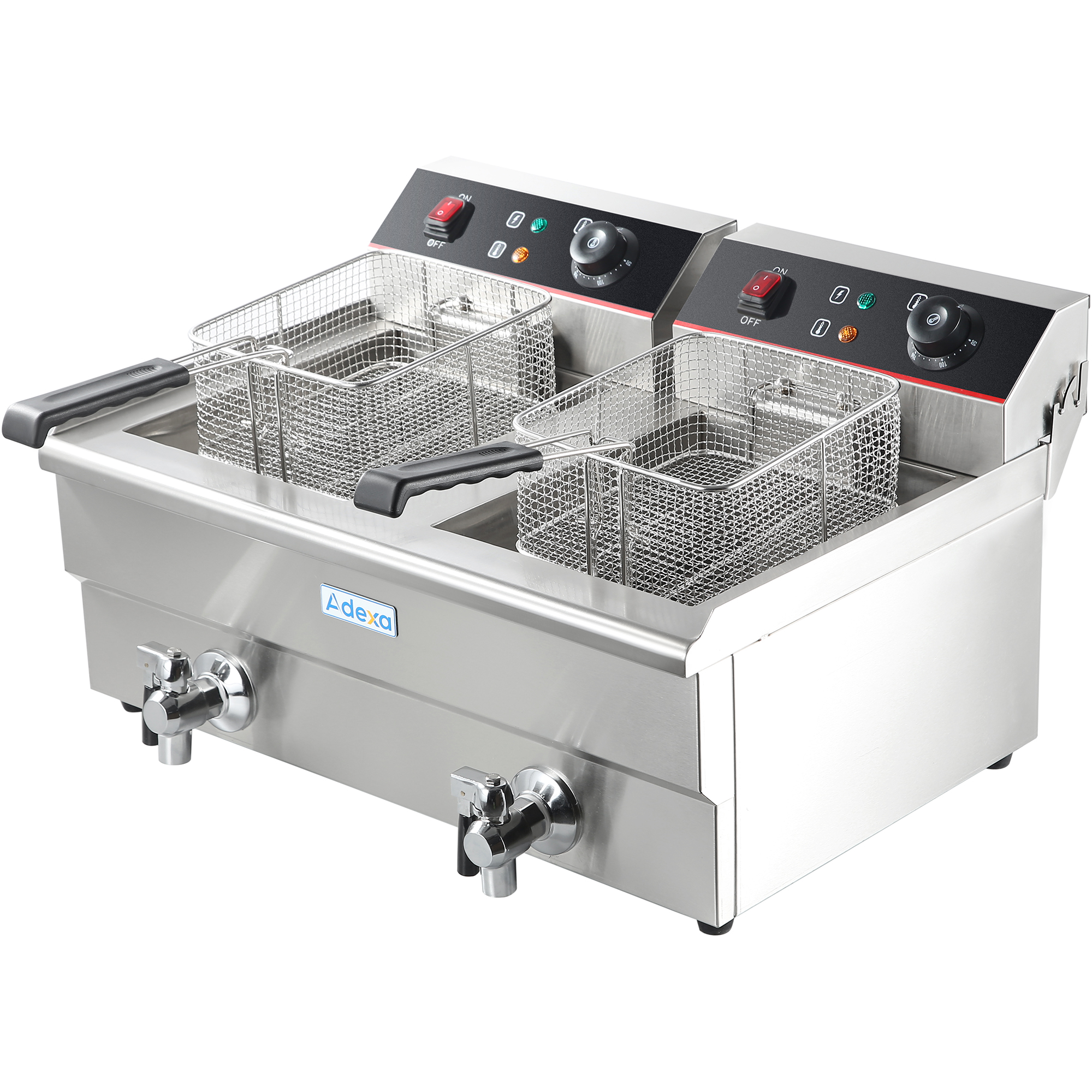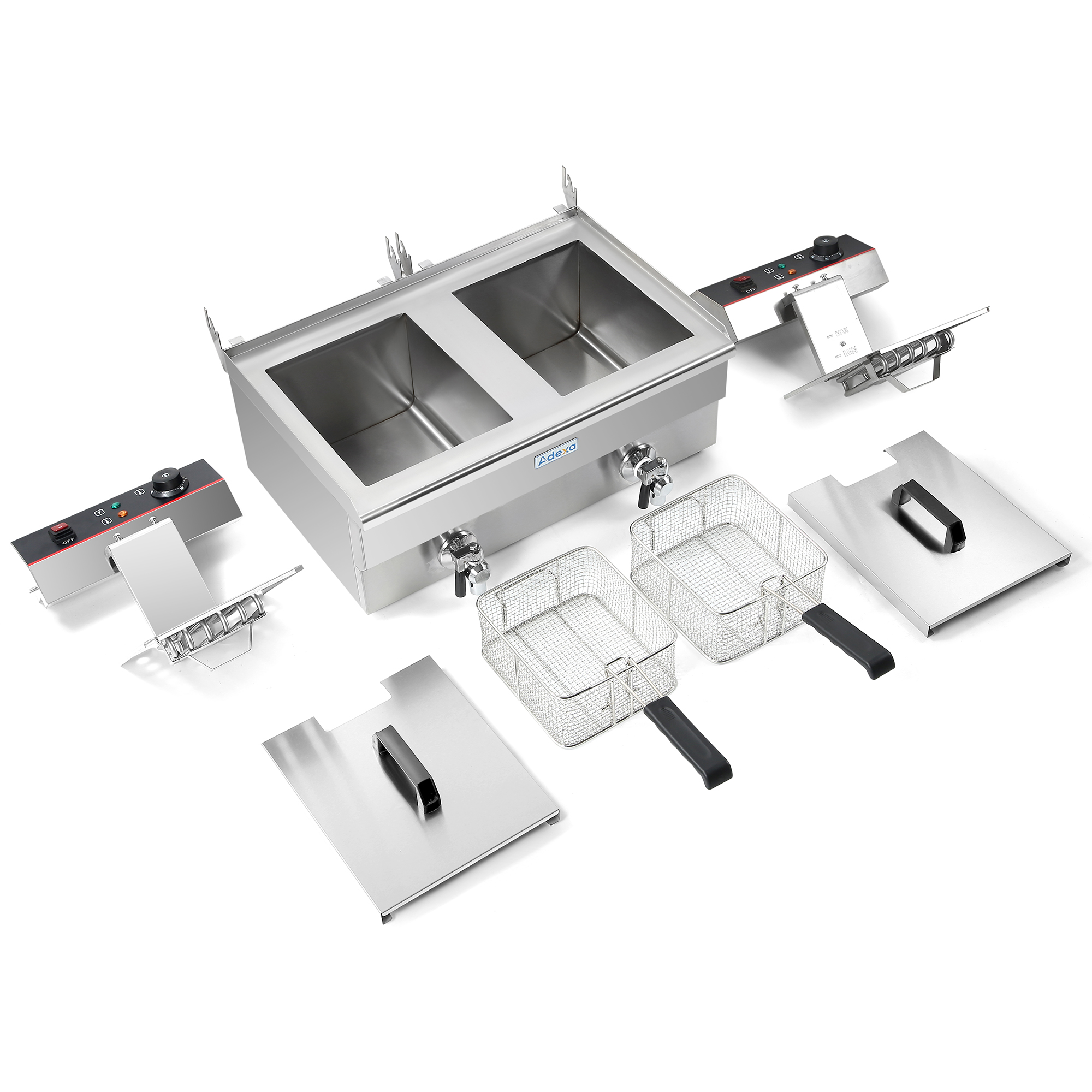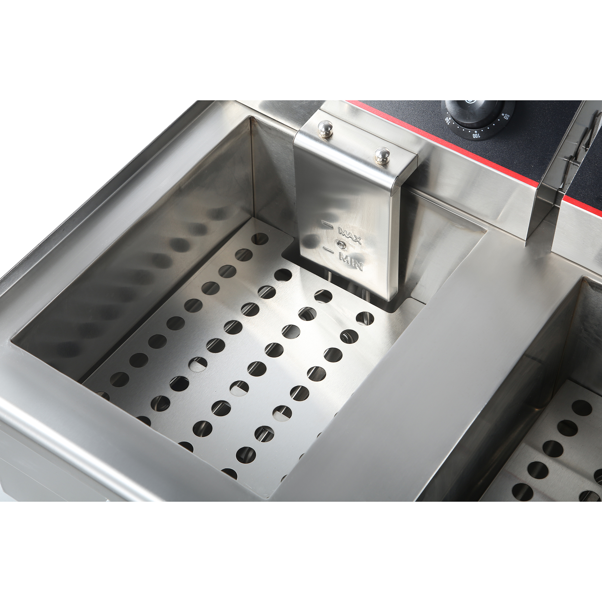 Laadukas kaksisäiliöinen ammattimainen sähköinen rasvakeitin. Uskomattoman tilaa säästävä 580 mm leveydellään, mutta suurella kapasiteetilla 2 x 16 litran säiliöt. Ihanteellinen laite suurituottoisille pikaruokaravintoloille, se on välttämätön jokaiselle ravintolalle, kahvilalle, noutoruokapaikalle tai ruokasalille. Suuret alennukset tällä hetkellä tämän edullisen myyntihinnan ansiosta. 16 + 16 litraa 5000 + 5000W Kaksinkertainen säiliö 2 koria Katso tarkemmat tiedot kohdasta ’Tekniset tiedot’.