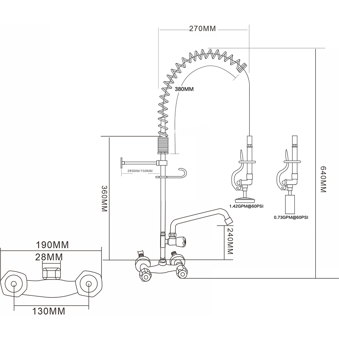 Ammattimainen ja erittäin kestävä esihuuhteluruisku, joka sopii erinomaisesti elintarvikealalle, kaupallisiin keittiöihin, ravintoloihin ja hotellikäyttöön. Seinäkiinnitys Tuloaukot sekä kuumalle että kylmälle vedelle Tukevan rakenteen ruostumatonta terästä