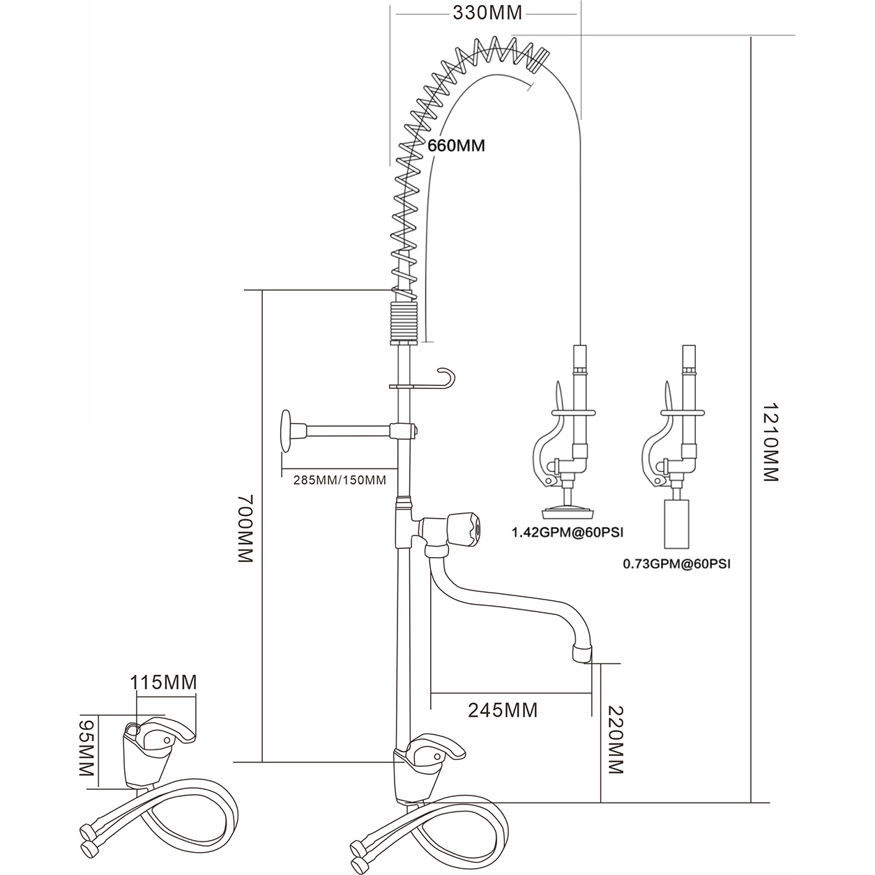 Ammattimainen ja erittäin kestävä esihuuhtelusuutin, joka on ihanteellinen elintarvikepalveluille, ammattikeittiöille, ravintoloille ja hotellisovelluksille. Seinälle asennettava tyyppi, kaksinkertainen tulovesiliitäntä (kuuma ja kylmä vesi), kestävää ruostumatonta terästä