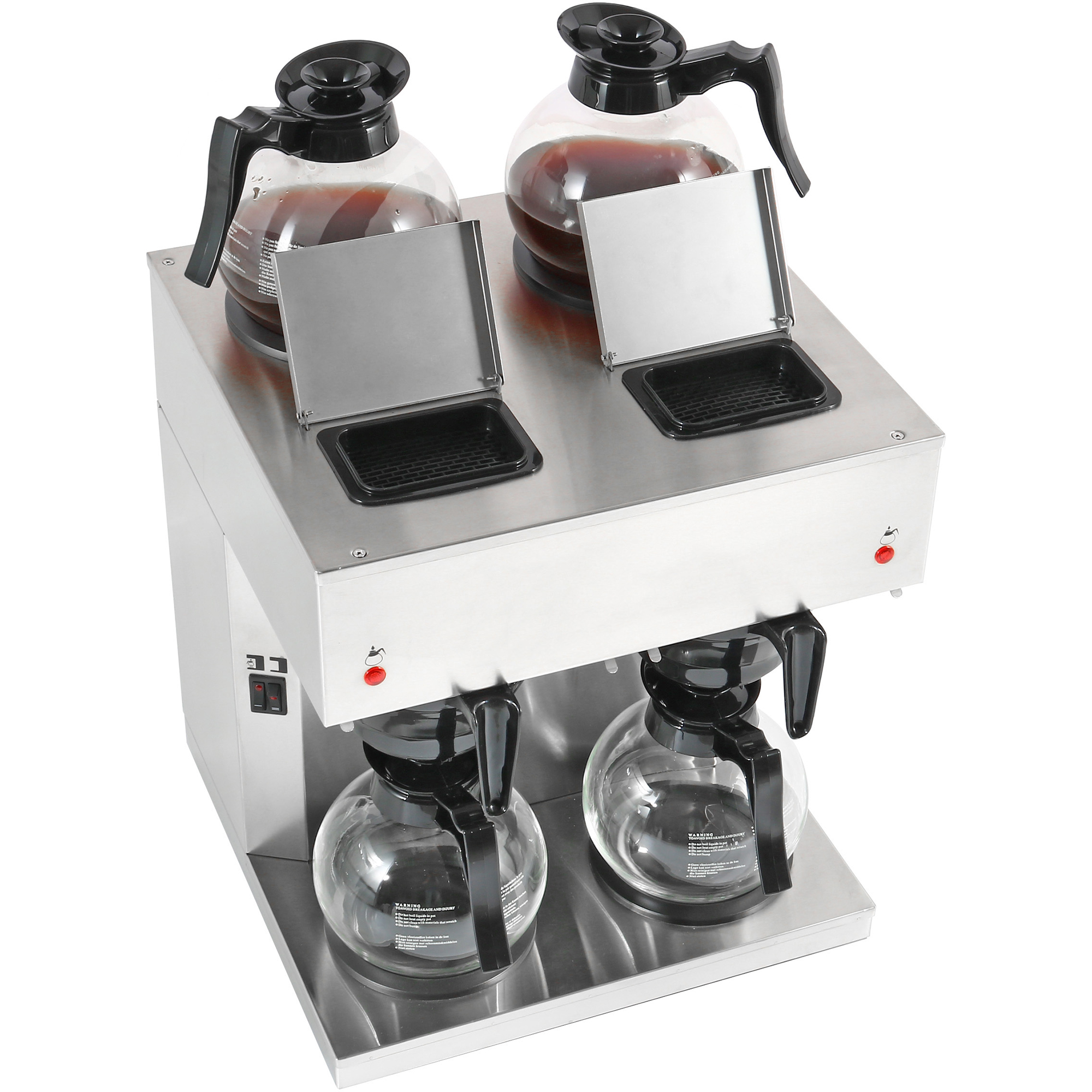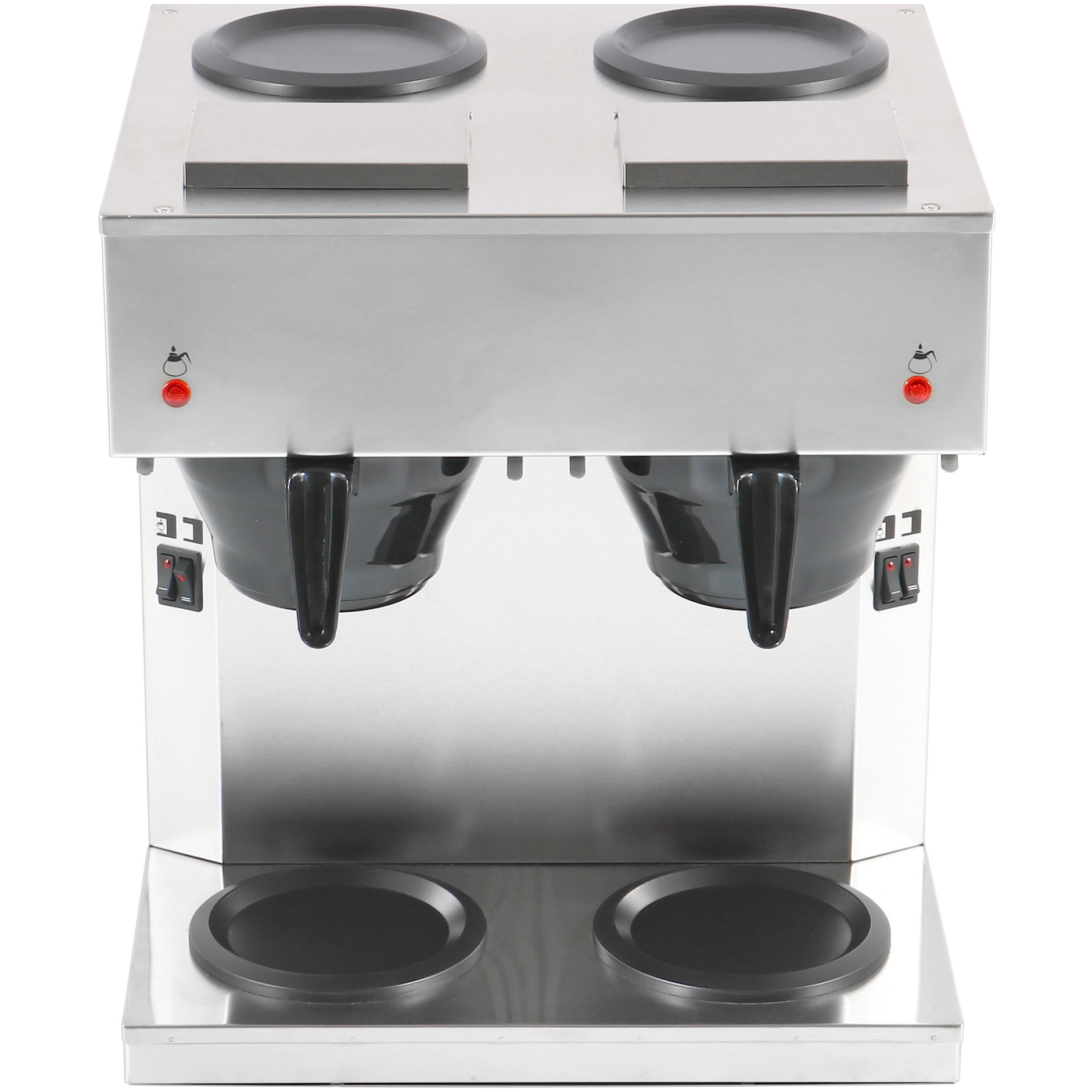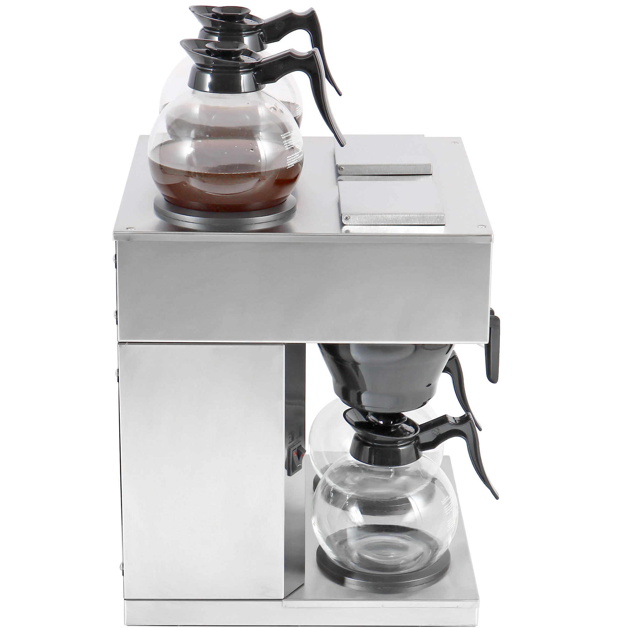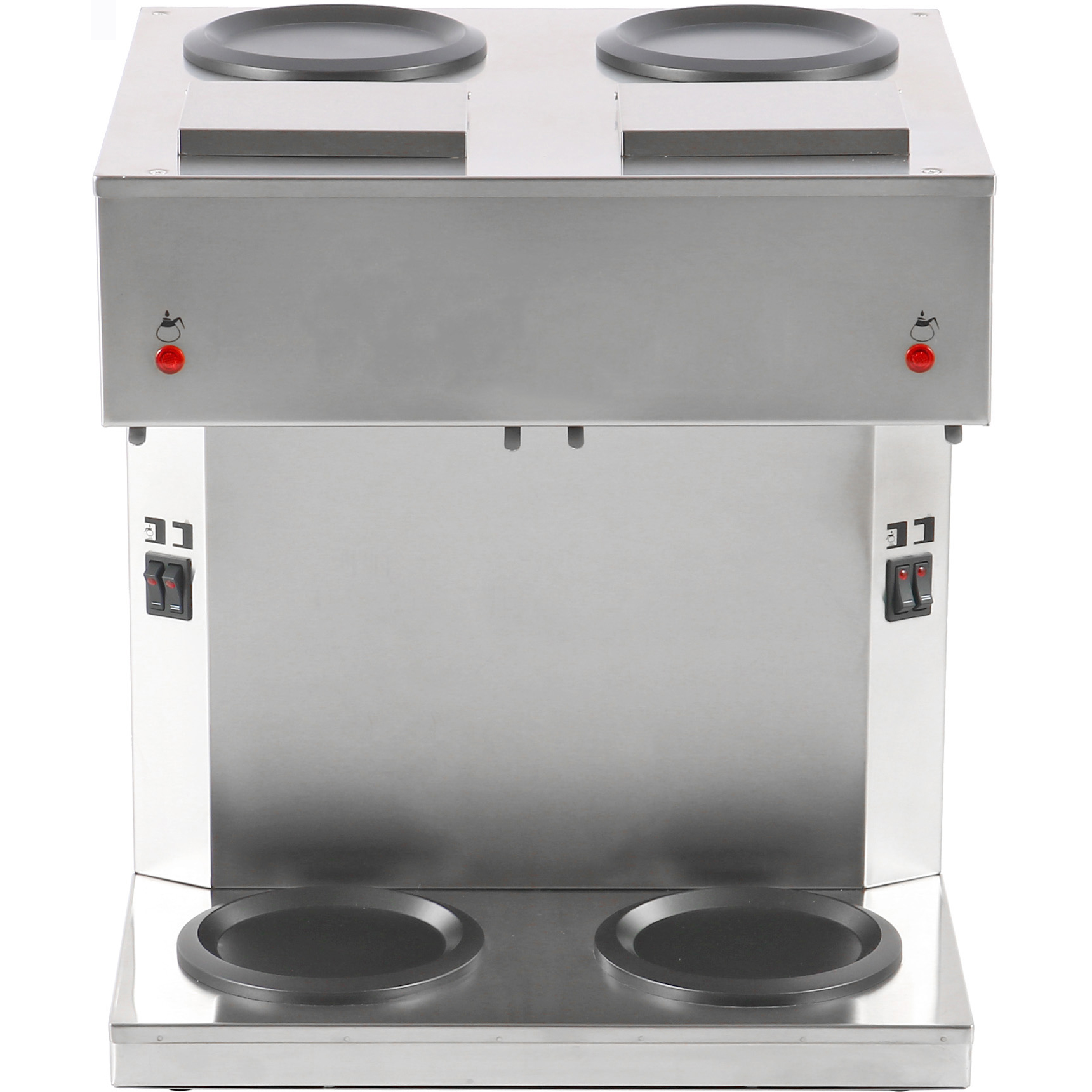 Valmista asiakkaille tai vieraille herkullista kahvia ammattimaisella kaksoissuodatin kahvinkeittimellä. Tämä catering-käyttöön tarkoitettu manuaalitäytteinen kahvinkeitin on suunniteltu julkisiin tiloihin, joissa tarvitaan erinomaista kahvia helposti, mukavasti ja nopeasti, kuten toimistoihin, kokoushuoneisiin, klubeihin, baareihin ja ravintoloihin. Moderni virtaviivainen muotoilu tuo täysin uuden mukavuuden ja ylellisyyden tunteen kaupallisiin kahvinkeittimiin. Sisältää kaksi 2,2 litran sisäistä vesisäiliötä ja neljä erikseen säädettävää kuumalevyä – voit täyttää kaksi täydellistä 1,8 litran kannua ja pitää ne lämpiminä ennen kuin kone täytyy täyttää uudelleen. Jopa 280 kuppia tunnissa (33,4 litraa) Kapasiteetti (kannu): 2 x 1,8 litraa Kapasiteetti (säiliö): 2 x 2,2 litraa Keittolämpötila: +92C – +96C Keittoaika: 6-7 minuuttia Teho: 2×2,02kW Virtalähde: 230 / 1 vaihe Kone ja suodinpidike ruostumatonta terästä Mukana 2 lasikannua ”Pump style” keittomenetelmä, vain tuoretta vettä jokaista kannua varten Kuumennetaan keittovesi vain tarpeen mukaan, energiatehokkainta. Kahvi valmistuu optimaalisessa lämpötilassa Kahvi pidetään aina optimaalisessa lämpötilassa Kolmoisturvasuojat Katso ’Tekniset tiedot’ kohdasta tarkemmat tiedot.