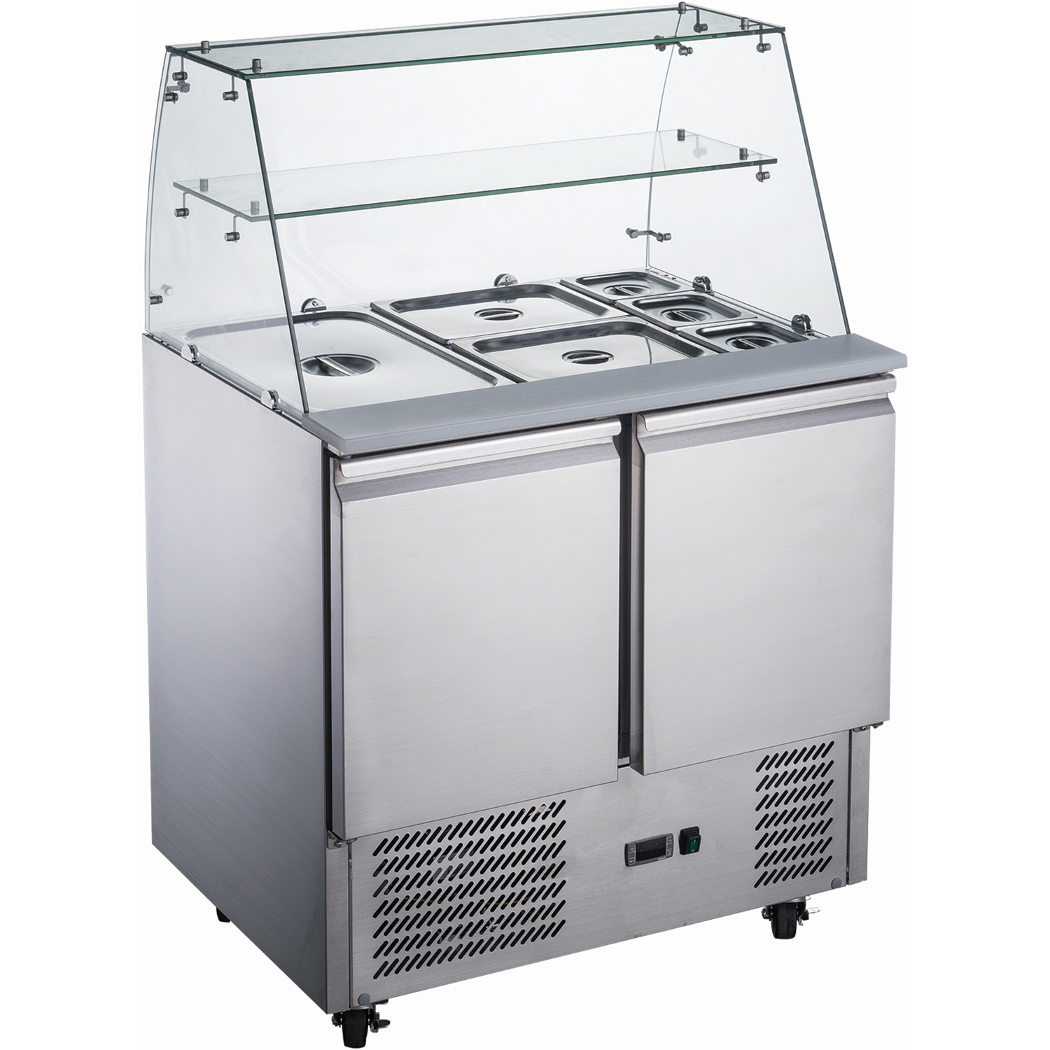 B-LUOKAN tuotteet, joissa on kuljetusvaurioita, lommoja, naarmuja. Tuotetta ei ole koskaan käytetty. Laaduntarkastus suoritettu ja toimiva kunto. Tuotekuva on vain havainnollistamistarkoituksessa, ei oikea tuote. EI PALAUTUSOIKEUTTA. Odotettu toimitusaika 5-6 työpäivää. Kaksiosainen lasikantinen saladette-jääkaappi on juuri sitä, mitä tarvitset kahvilaan, voileipäkauppaan, ravintolaan tai mihin tahansa ammattikeittiöön. Valmistettu korkealaatuisesta 304-luokan ruostumattomasta teräksestä, siinä on kolme itsestään sulkeutuvaa ovea, jotka pitävät tuotteesi tuoreina, elintarvikekäyttöön soveltuva muovinen valmistuspöytäalue ja tyylikäs lasikansi, joka sisältää hyllyn ei-pilaantuvien tuotteiden säilyttämiseen. Saladette on varustettu pyörillä, jotka helpottavat liikuteltavuutta. Korkealaatuinen ruostumaton teräs 304 sisä- ja ulkopuolella. CE-hyväksytty. CFC-vapaa kylmäaine ja vaahto. Automaattinen sulatus. Kondensaatioveden haihdutus. Digitaalinen lämpötilansäädin: Dixell. Pyöristetyt sisäkulmat helpottavat puhdistusta. Säädettävät PVC-pinnoitetut hyllyt ja hyllyn kannatin. Itsestään sulkeutuvat ovet, joissa on helposti puhdistettavat, vaihdettavat magneettiset ilmatyynygasketit. Raskaan käytön pyörät jarrulla. Säiliöt eivät sisälly hintaan. Katso tarkemmat tiedot kohdasta ’Tekniset tiedot’.