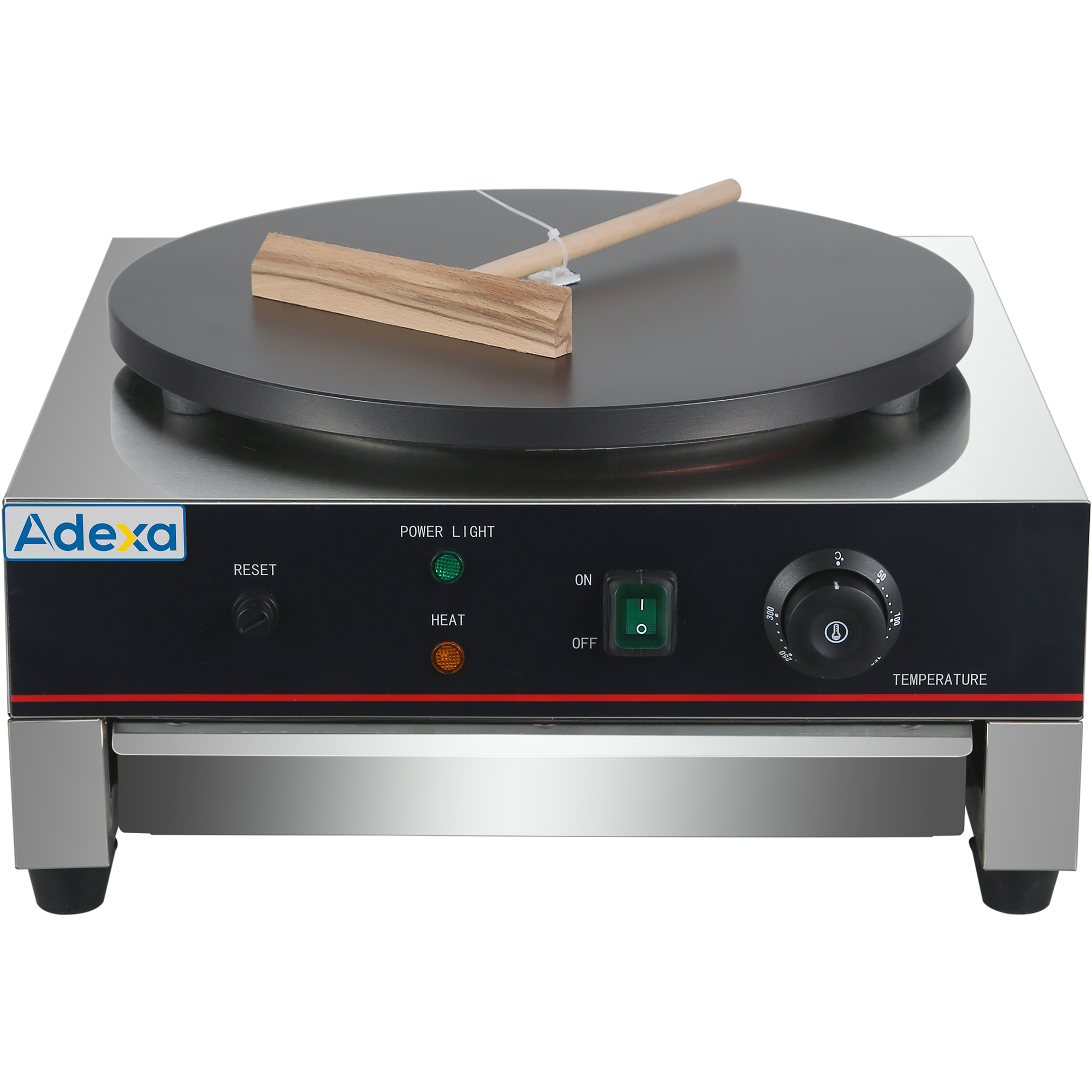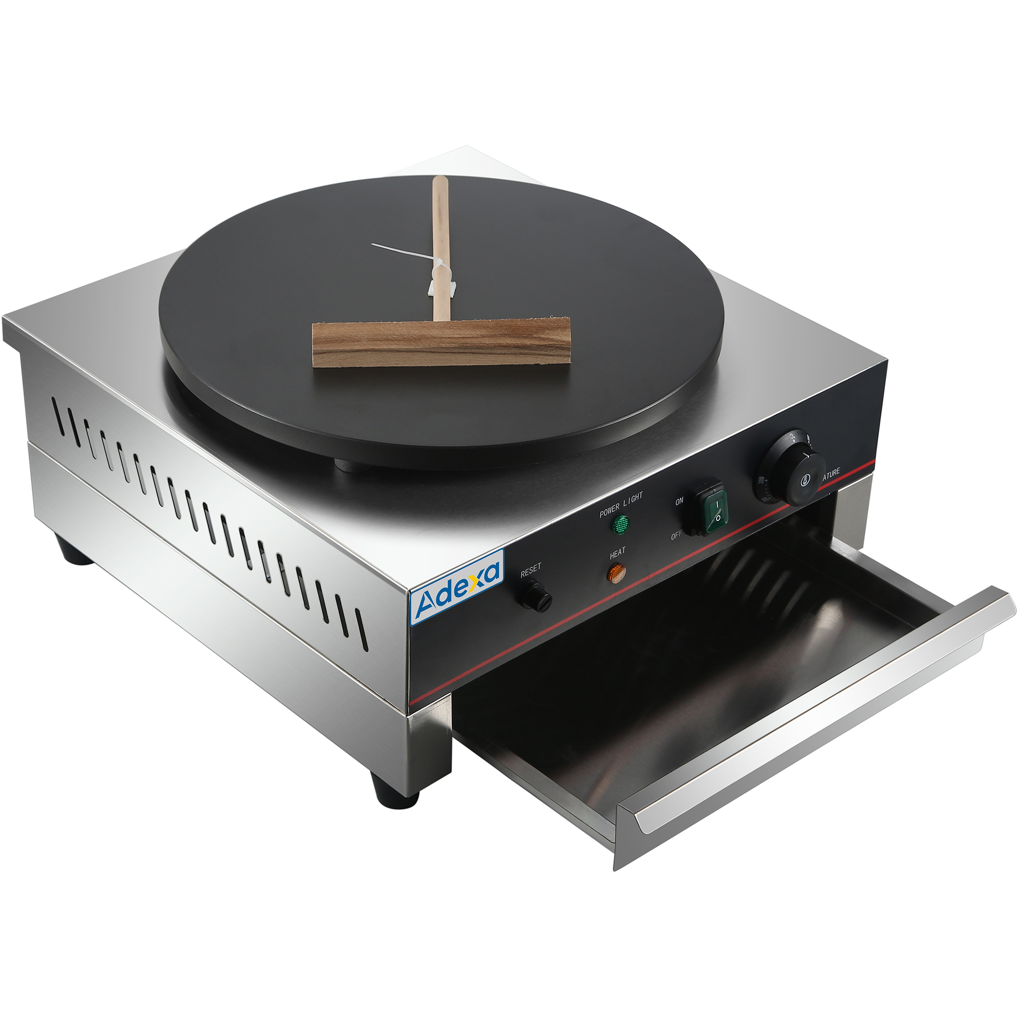 Korkealaatuinen ammattilaistason ohukaislevy. Valmista herkullisia ohukaisia tällä edullisella koneella. Sisältää metallisen T-muotoisen levittimen Kestävä ruostumattomasta teräksestä valmistettu rakenne Lämmitys- ja virtamerkkivalot Tarttumaton valurautalevy Liukumattomat jalat lisävakauden takaamiseksi Katso tarkat tiedot kohdasta ’Tekniset tiedot’.
