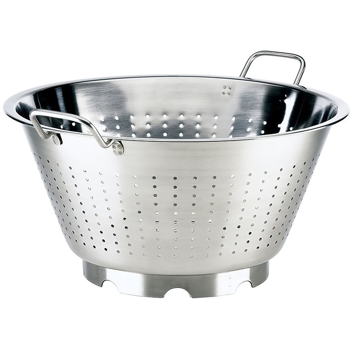 Tämä monipuolinen siivilä on erinomainen hedelmien, vihannesten ja pastan valuttamiseen tarkkojen reikien ansiosta. Kaksi tukevasti muotoiltua kahvaa mahdollistavat keittiöhenkilökunnan nopean ja vaivattoman suuren ruokamäärän valuttamisen ja kuljettamisen. Katso lisätietoja kohdasta ’Tekniset tiedot’.