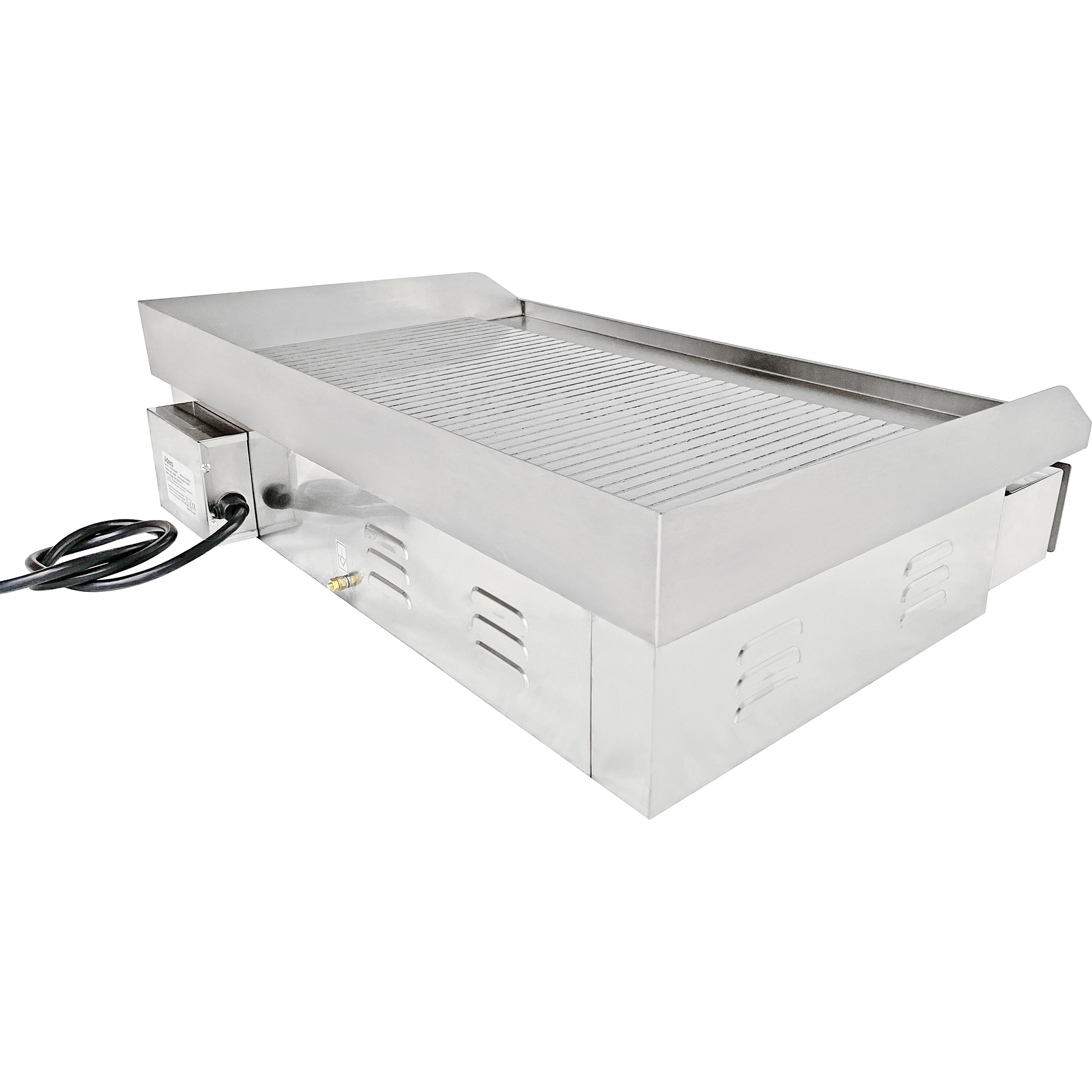 Tämä suuri sähköinen pöytägrillilevy on suunniteltu maksimaaliseen nopeuteen ja monipuolisuuteen. Kaksi itsenäisesti ohjattavaa lämmitysaluetta antavat sinulle mahdollisuuden valmistaa täydellisesti erilaisia tuotteita. Aseta yksi osa korkealle hampurilaisille, kanalle tai pekonille ja toinen matalalle paahdetuille sämpylöille tai munille. Tämä estää yhden tuotteen palamisen muiden kypsyessä. Voit nopeasti valmistaa useita suosittuja annoksia tällä kaupallisella sähköisellä paistolevyllä! Olitpa sitten valmistamassa pannukakkuja, hampurilaisia, grillattuja juustovoileipiä tai munakokkelia, tämä raskaan käytön ruostumattomasta teräksestä valmistettu grillilevy tarjoaa kestävyyden ja suorituskyvyn, jota tarvitset työsi suorittamiseen. Paksu teräksinen paistopinta lämpenee tasaisesti koko levyn alueella tuottaen tasaisia kypsennystuloksia riippumatta siitä, mihin asetat ruoan grillilevyllä. Grillilevyn etuosassa oleva kanava kerää rasvaa ja ohjaa sen irrotettavaan rasvatarraan. Kun on aika siivota, lokero voidaan irrottaa ja tyhjentää nopeasti. Katso tarkat tiedot kohdasta ’Täsmennykset’.