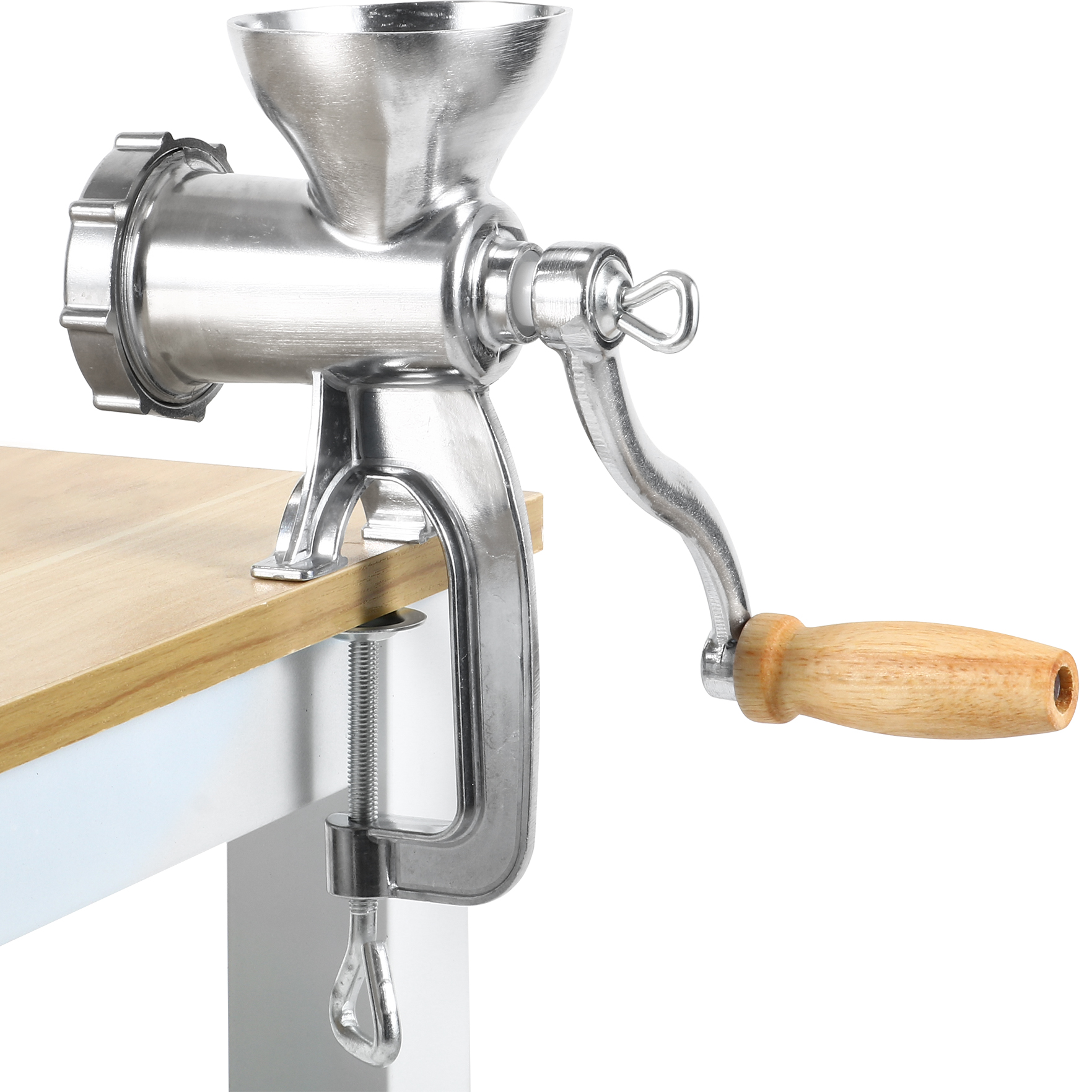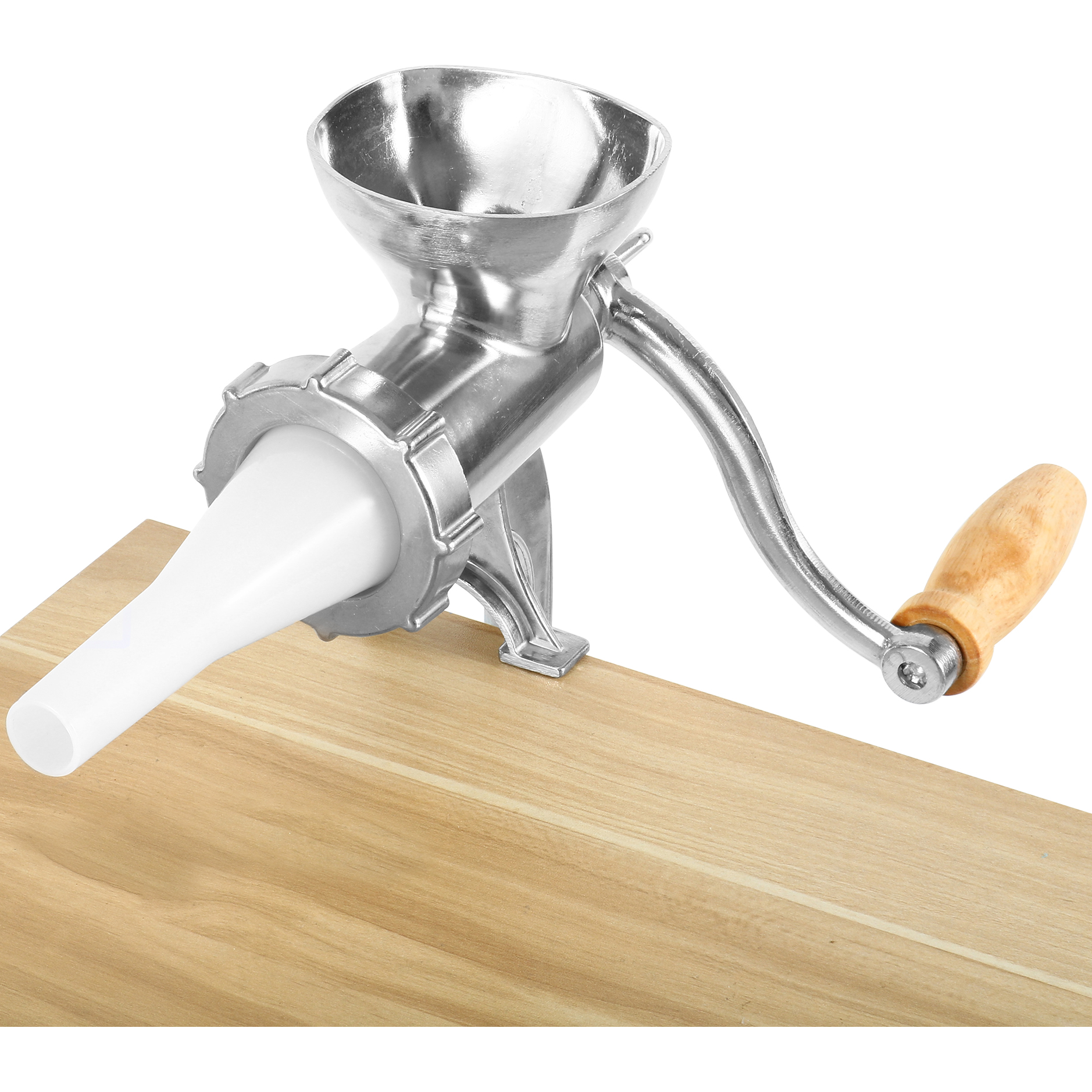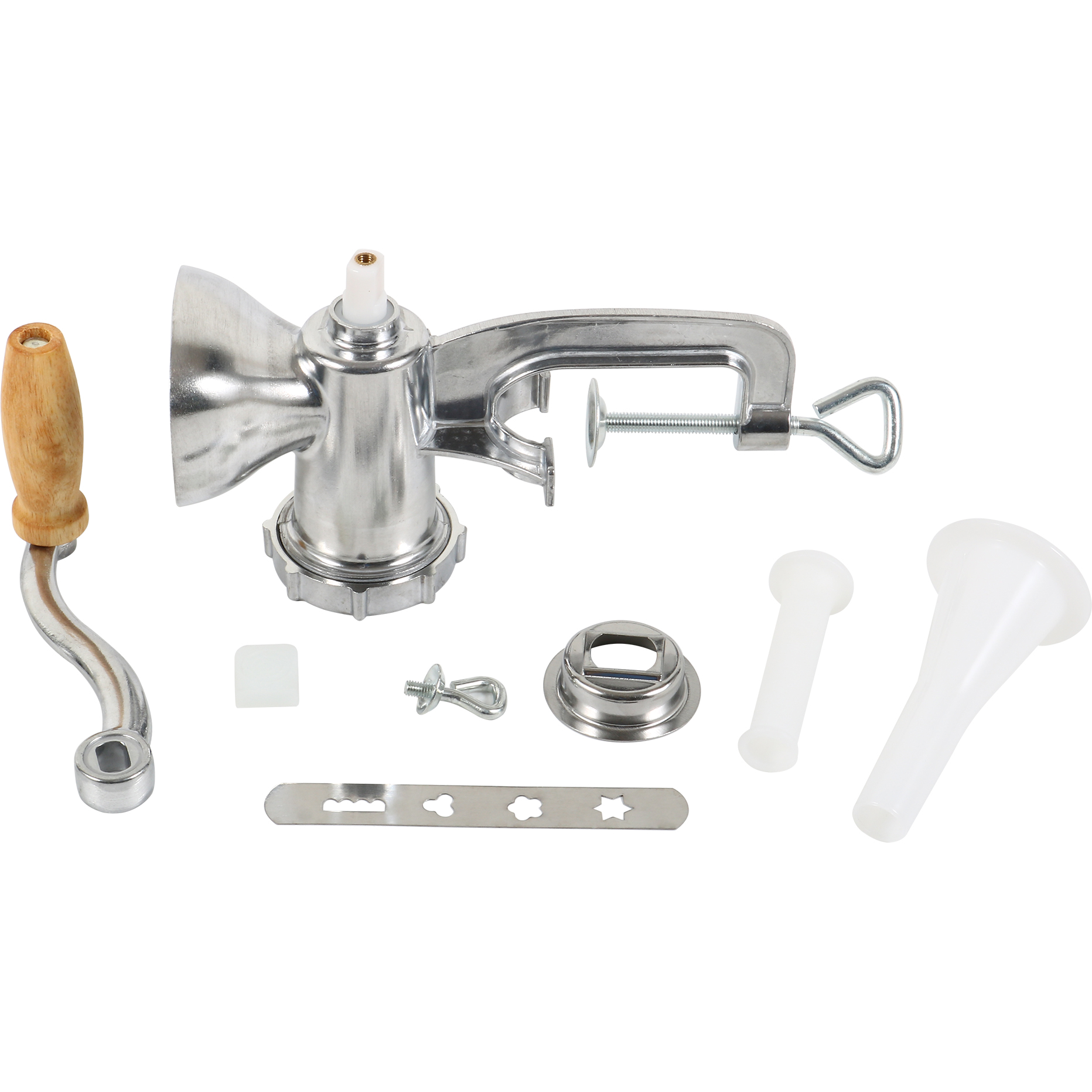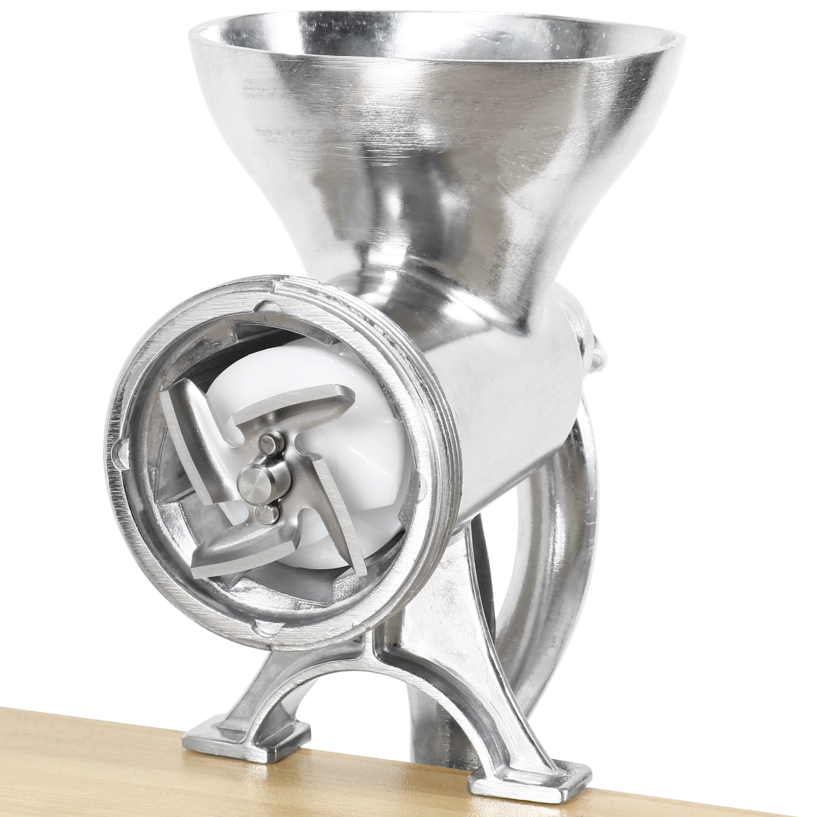 Valmista makkaroita, hampurilaisia ja paljon muuta tämän manuaalisen lihamyllyn avulla! Siinä on puristin, jonka avulla voit kiinnittää sen suoraan työtasoosi. Tämä manuaalinen lihamylly jauhaa 1-2 kg lihaa minuutissa. Mukana tulee jauhatuslevy sekä täyttösuppilo laipalla ja tähtitäytin eri lihanjauhatus- ja täyttötarkoituksiin. Laitteen elintarviketurvallinen tina-pinnoite ja nailonruuvilevy takaavat, että tämä lihamylly kestää aikaa.