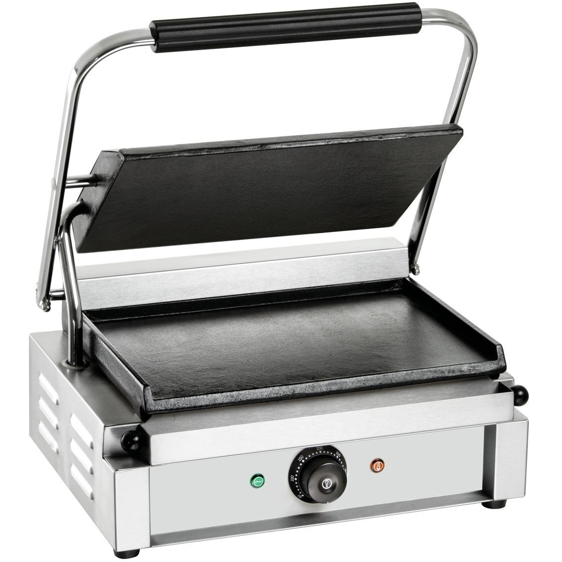 Ammattikäyttöön tarkoitettu paninigrilli, jolla on laaja valikoima ravintolakäyttömahdollisuuksia. Välttämätön jokaiseen ravintolakeittiöön. Teho: 2,2 kW Työalue: 338×220 mm Alaosan levyn koko: 340×230 mm Varustettu valuraudasta tehdyillä levyillä, jotka takaavat tasaisen kypsennyksen. Ylälevy on tasapainotettu itsestään ja painejousi on säädettävissä, joten voit mukauttaa kypsennyksen ruoan mukaan. Sileä ylä- ja alaosa Termostaatti 0–+300 °C Mehukaukalo Kuumuutta kestävät kahvat Merkkivalot Asiakirjat Napsauta tästä ladataksesi käyttöohje Napsauta tästä ladataksesi räjäytyskuva Katso tarkat tiedot kohdasta ’Tekniset tiedot’.