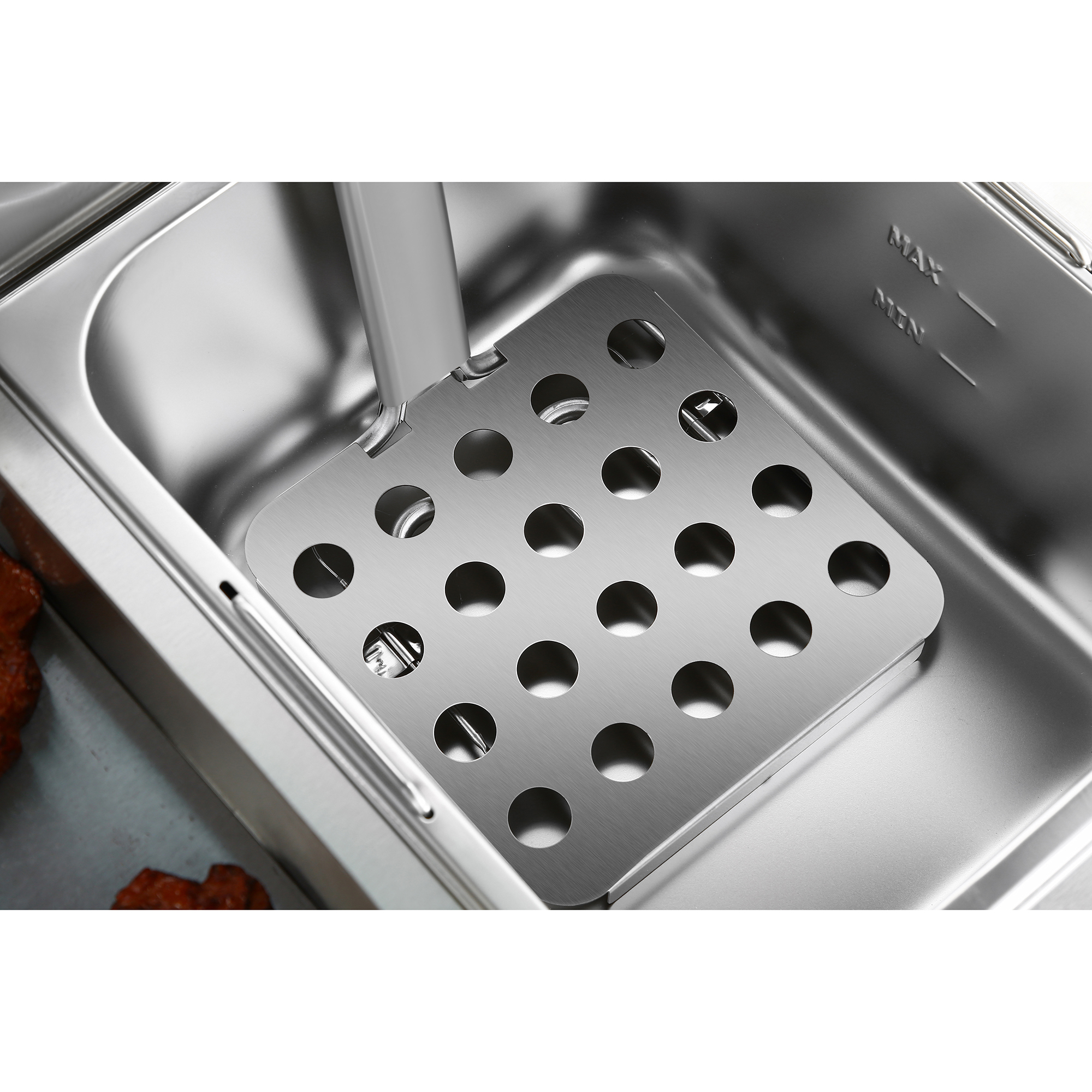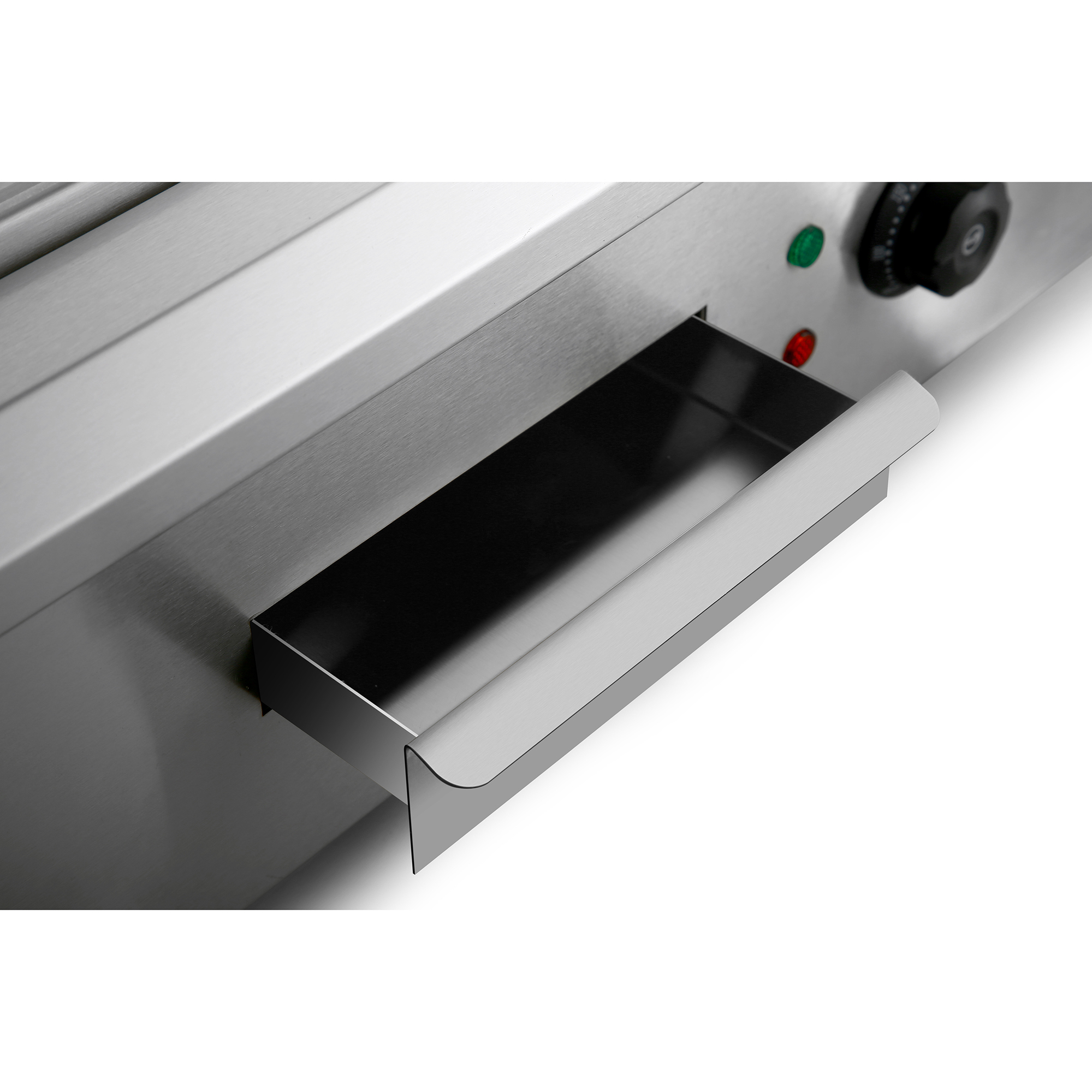Parila ja uppopaistokombo on loistava apuri yhtenäisten ja rapeiden ruokien, kuten ranskalaisten, donitsien, rinkilöiden, sipulirenkaiden, katkarapukääröjen jne. valmistamiseen. Suunniteltu myös pöytätasolle pariloitavien ruokien, kuten pannukakkujen, rapean pekonin, fajitojen, munakkaiden jne. grillaamiseen. Ihanteellinen valinta sekä koti- että kaupalliseen käyttöön. Tämä tasoparila ja paistokombo on valmistettu elintarvikelaadusta ruostumattomasta teräksestä, vahvistettu ja kestävä rakenne, varustettu eturasvakanavalla ja sileällä pinnalla, joka on helppo pyyhkiä puhtaaksi ja joka ei ruostu helposti. Kumijalat pitävät koneen vakaana työtasolla. Erilliset tehosäätimet, parilan ja paistimen tehoa voidaan säätää itsenäisesti. Katso tarkempi tiedot kohdasta ’Tekniset tiedot’.