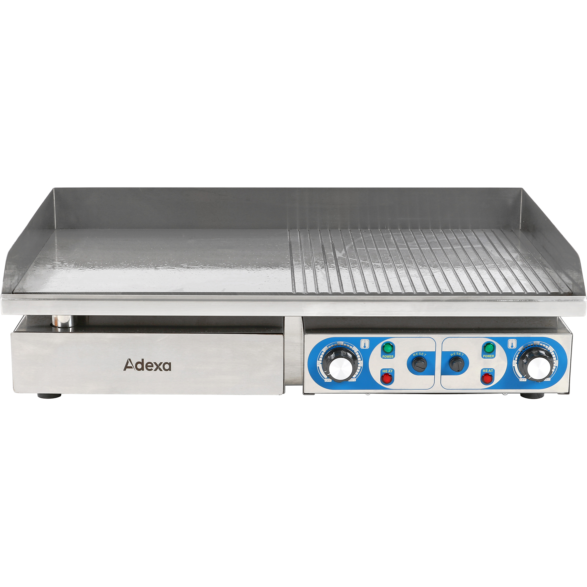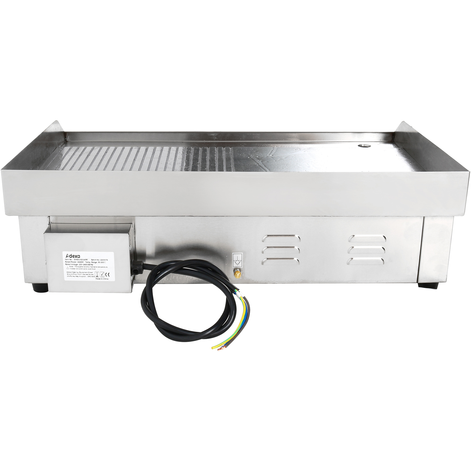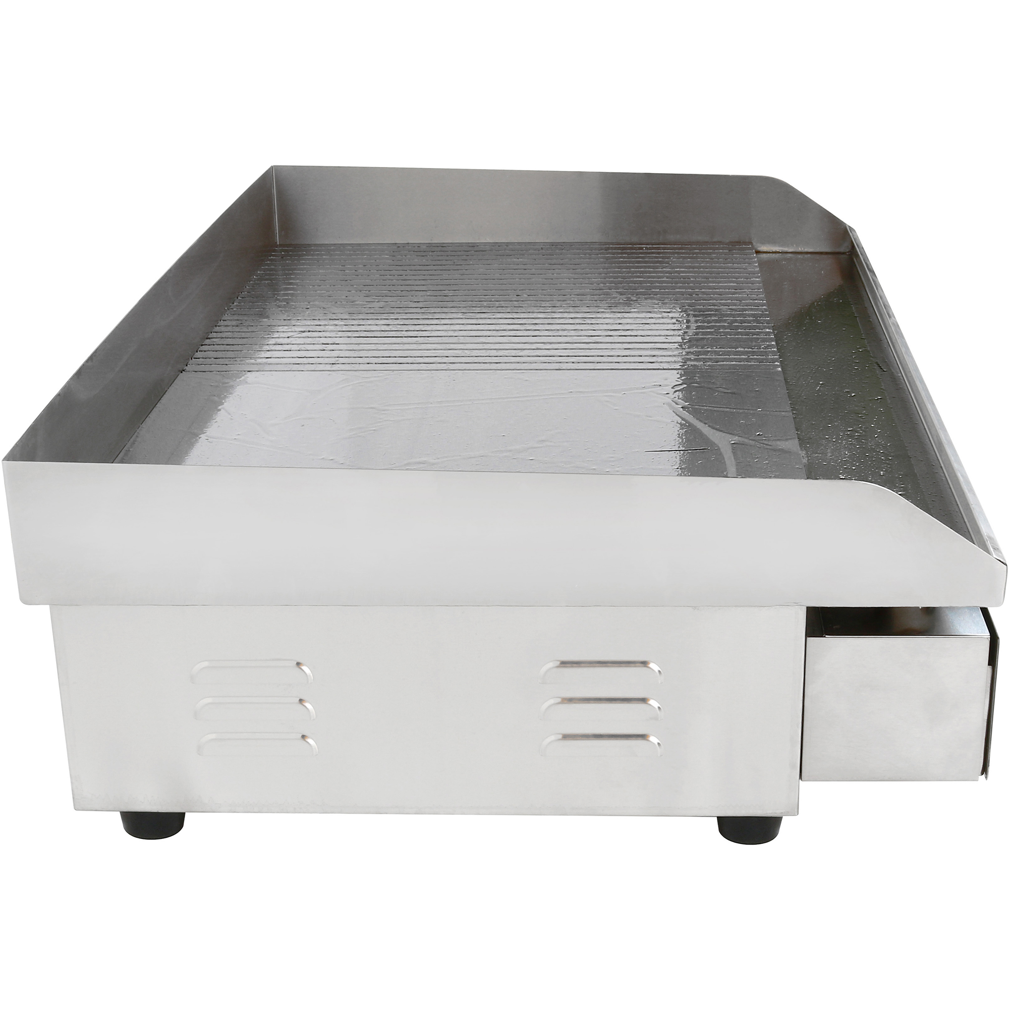 Tämä suuri sähköinen pöytäparila on suunniteltu maksimaaliseen nopeuteen ja monipuolisuuteen. Kaksi itsenäisesti hallittavaa lämmitysvyöhykettä antavat mahdollisuuden valmistaa täydellisesti erilaisia tuotteita. Aseta yksi osio korkealle lämpötilalle hampurilaisia, kanaa tai pekonia varten ja toinen matalalle lämpötilalle paahtoleipää tai munia varten. Näin vältät yhden tuotteen palamisen samalla, kun muut valmistuvat. Voit nopeasti valmistaa erilaisia suosittuja ruokia tällä kaupallisella sähköisellä paistolevyllä! Olitpa sitten tekemässä pannukakkuja, hampurilaisia, grillattuja juustoja tai munakokkelia, tämä raskaan käytön ruostumattomasta teräksestä valmistettu parila tarjoaa kestävyyden ja suorituskyvyn, joka on tarpeen työn suorittamiseksi. Paksu teräs kypsennyspinta lämpenee tasaisesti, jotta saat johdonmukaisia tuloksia, riippumatta siitä, mihin kohtaan asetat ruoan parilalevyllä. Parilan etupuolella kulkee ura, joka kerää rasvan ja ohjaa sen irrotettavaan rasva-alustaan. Siivouksen aikaansa lähestyessä alusta voidaan poistaa ja tyhjentää nopeasti. Katso ’Tekniset tiedot’ löytääksesi yksityiskohtaisia tietoja.