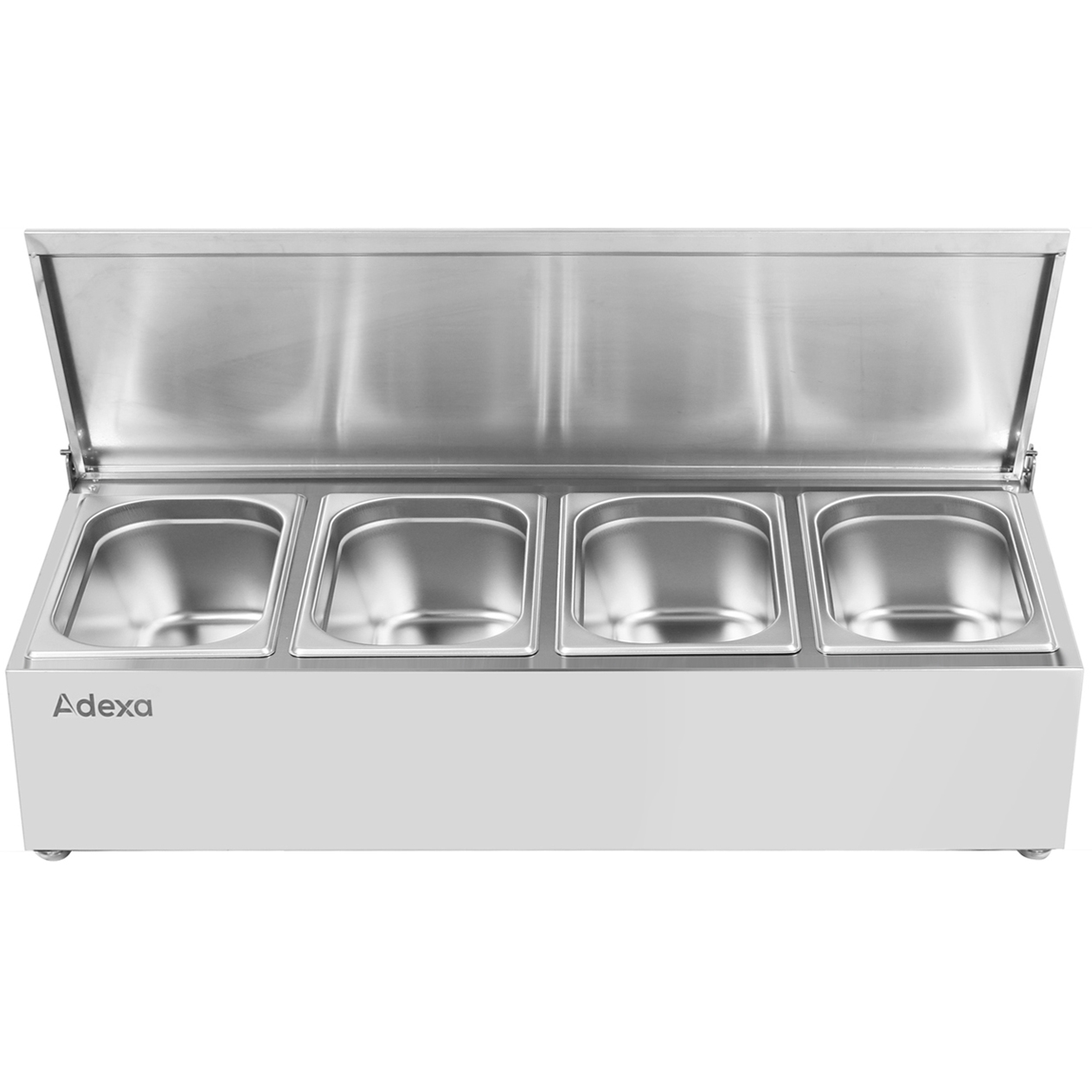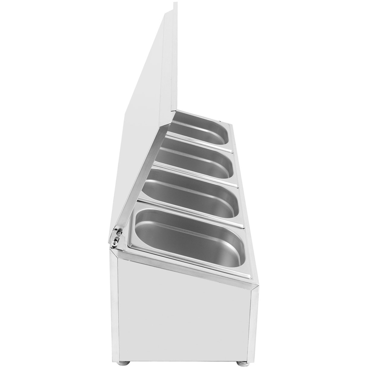 Tämä mausteteline on täydellinen ruoan esillepanoon buffetilla tai ruoanvalmistuspisteessä keittiössä. Vahvasta ruostumattomasta teräksestä valmistettuna astiateline on erittäin kestävä ja pitkäikäinen, mikä mahdollistaa sen käytön vuosikausien ajan raskaassa käytössä ja vähentää siten tarvetta hankkia uusia. Sileä ruostumaton teräs on myös erittäin helppo puhdistaa. sisältää 4xGN1/4-100mm astiat.