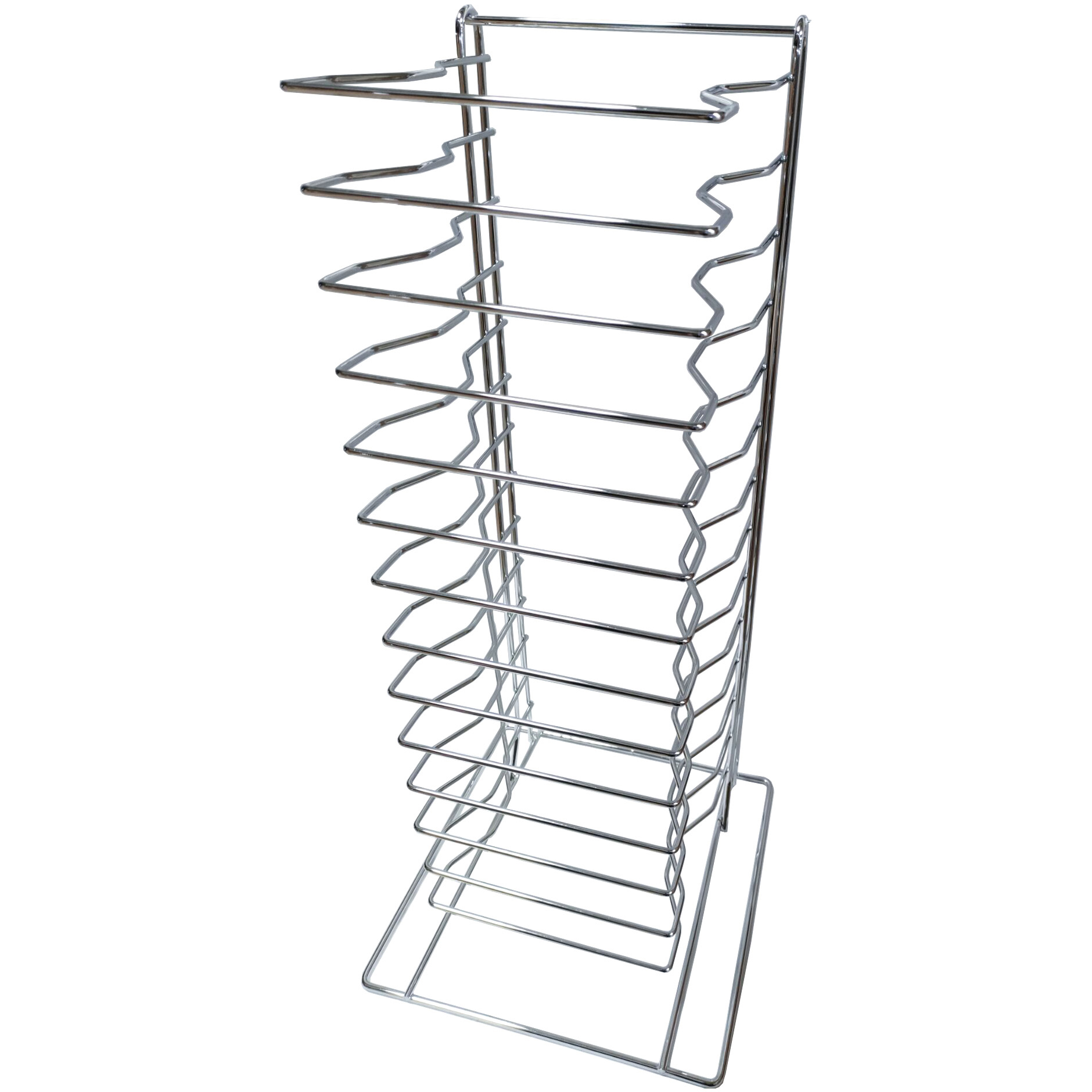Kaupallinen pannujen pinoamisteline, johon mahtuu 14 pannua ja tarjotinta. Tarkempia tietoja löydät kohdasta ’Tekniset tiedot’.